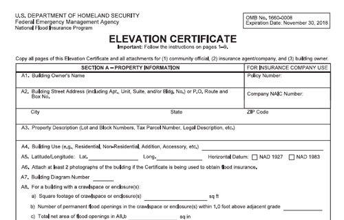 An Elevation Certificate may be required by the lender or insurer of your property to ascertain if it falls within a designated flood hazard area. The Elevation Certificate is an important administrative tool of the National Flood Insurance Program (NFIP). It is to be used to provide elevation information necessary to ensure compliance with community floodplain management ordinances, to determine the proper insurance premium rate, and to support a request for a Letter of Map Amendment (LOMA) or Letter of Map Revision based on fill (LOMR-F).